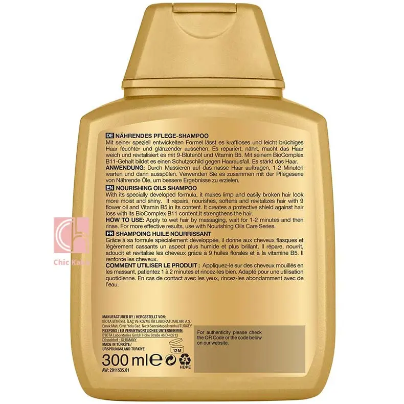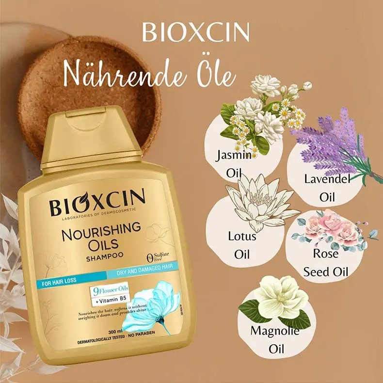 شامپو بیوکسین Nourishing Oils حاوی روغن ۹ گیاه، مخصوص موهای خشک و آسیبدیده طراحی شده است. این شامپو با ترکیب منحصربهفردی از ۹ نوع روغن گیاهی (مانند یاسمن، اسطوخودوس، گل نیلوفر، پرتقال ، مونوی و غیره) به همراه ویتامین B5 و فرمول پتنتشده BioComplex B11، به بازسازی ساختار مو، افزایش نرمی و درخشندگی کمک میکند.