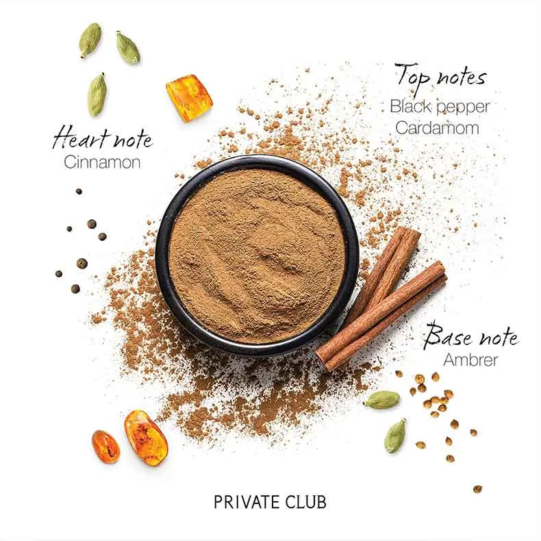 رایحه پرایوت کلاب با انفجاری از فلفل سیاه، هل و ترنج آغاز میشود که انرژی و هیجان را در لحظه اول به مشام میرساند. در قلب ترکیب، سیب قرمز و دارچین حضور دارند که گرما، شیرینی و عمق خاصی به عطر میبخشند. نت پایانی از کهربا (Amber) و پچولی (Patchouli) ساخته شده که حس مردانه، ماندگاری بالا و جذابیتی اغواگر را تا ساعتها حفظ میکند.